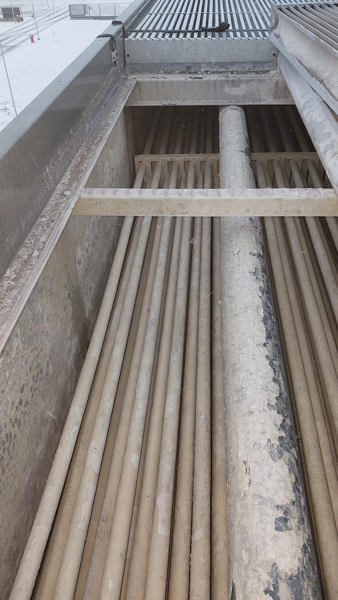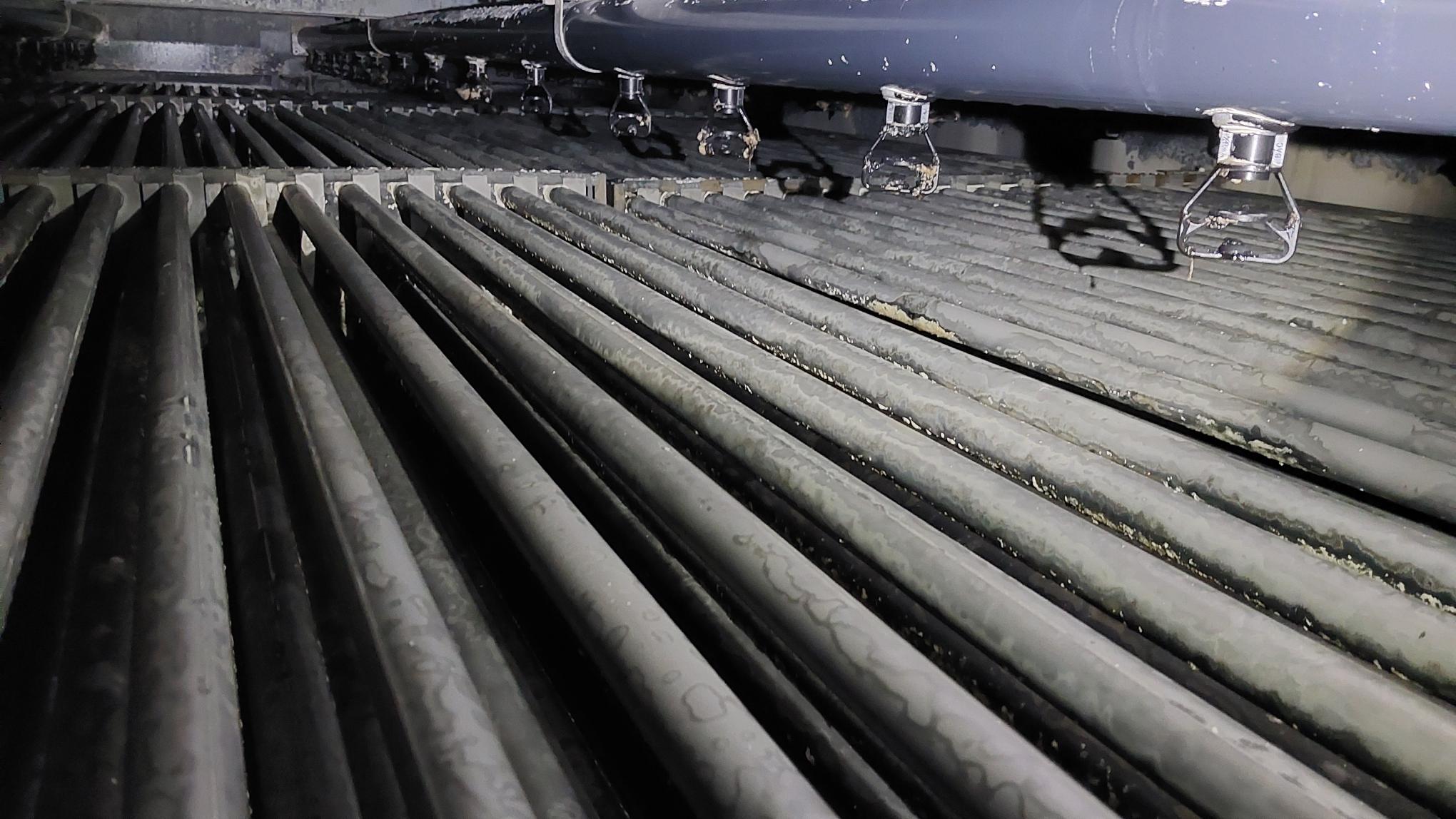 Los condensadores evaporativos están equipados con un haz de tubos que contiene refrigerantes -como el amoníaco- en su interior. Durante el funcionamiento, se utiliza agua para enfriar el medio dentro de los tubos. Cuando el tratamiento del agua no funciona correctamente, se producen incrustaciones, normalmente en forma de sarro (carbonato cálcico). La acumulación de incrustaciones será mayor en el haz de tubos, ya que es allí donde se produce la transferencia de calor. Mantener los tubos limpios es crucial para mantener un sistema que funcione eficientemente. Resumiendo: