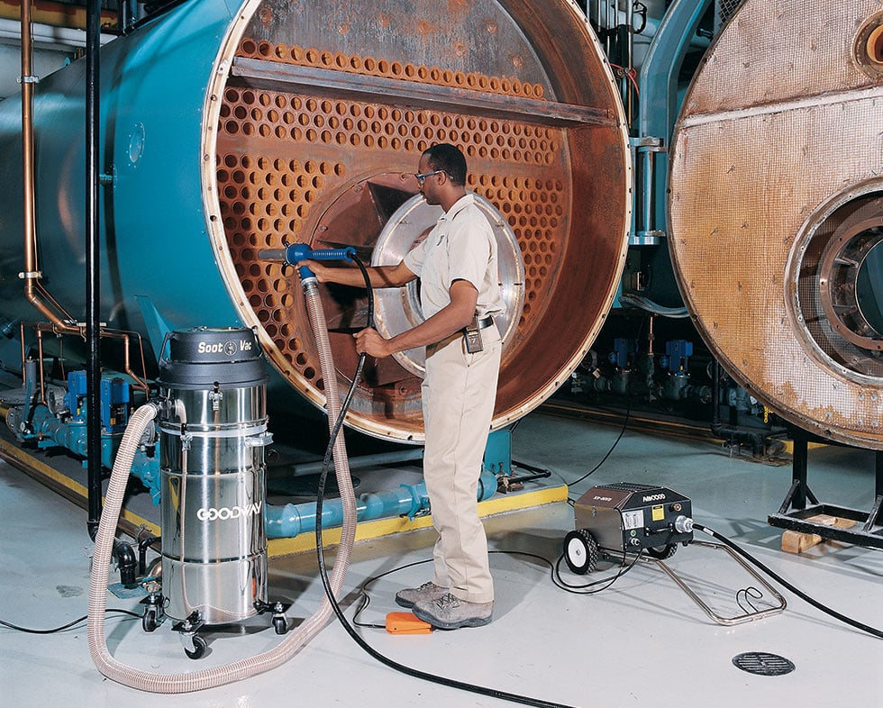 El aspirador industrial Goodway GTC-540A es un sistema de alto rendimiento diseñado para eliminar el polvo desprendido y los depósitos de hollín durante los trabajos de limpieza de los tubos de humo de las calderas.