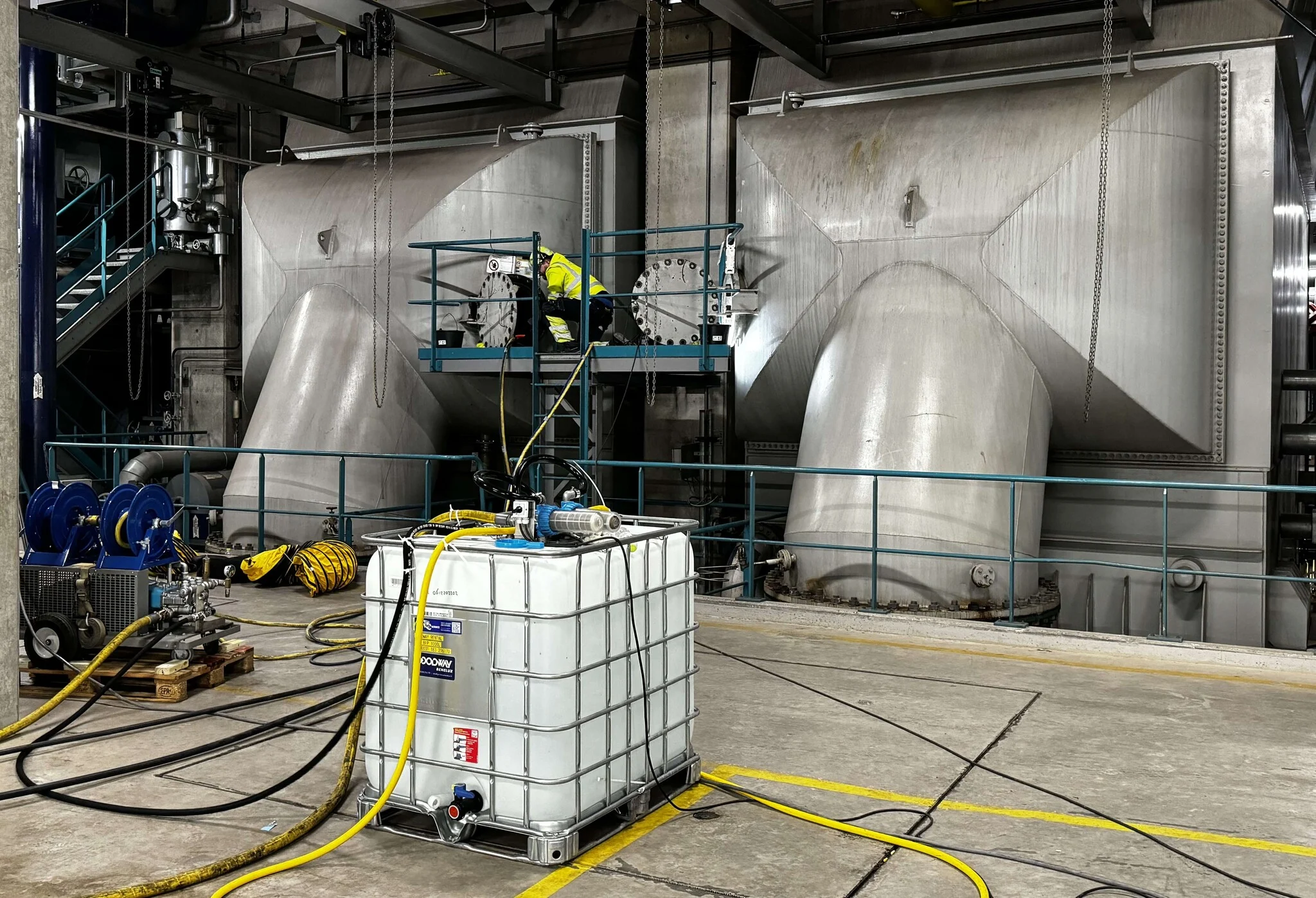 En nuestras instalaciones teníamos problemas con un intercambiador de calor de titanio que estaba totalmente obstruido con depósitos blandos. Tras contactar con los expertos de Goodway Benelux, llegamos a la conclusión de que el sistema BFP era la mejor solución para abrir y limpiar los tubos. Se seleccionaron proyectiles de plástico más blandos para no causar daños al material de titanio. Tras aumentar el tamaño de la espoleta durante el arranque inicial, pudimos realizar la mayor parte de la limpieza con el proyectil grande, rápida y fácilmente. Para los demás tubos, utilizamos un sistema rotativo de limpieza de tubos para realizar una limpieza manual y precisa. El resultado fue una buena refrigeración. Veremos durante cuánto tiempo. El contenido de partículas del medio es bastante alto.