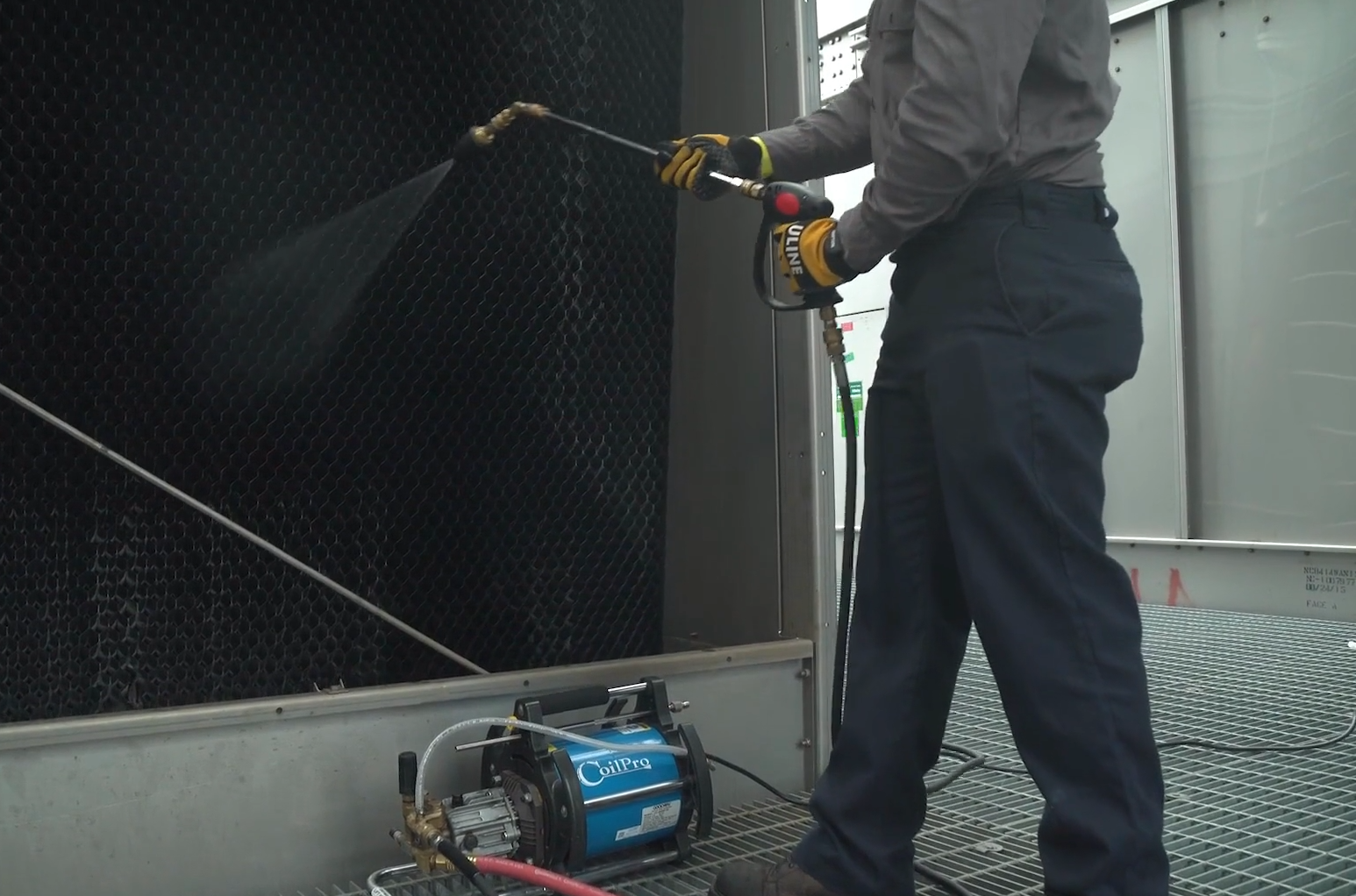 Cuando los componentes de las torres de refrigeración se ensucian con incrustaciones y depósitos biológicos, Goodway proporciona una solución eficaz utilizando los sistemas CC-400HF y TFC-JR, y ScaleBreak-Gel. En estas situaciones, ScaleBreak-Gel se aplica directamente sobre las superficies incrustadas. Este producto químico está especialmente formulado para limpiar el relleno de torres de refrigeración y otras superficies verticales. Este gel ácido de alta viscosidad se adhiere a las superficies para eliminar eficazmente los depósitos minerales y las incrustaciones. Una vez eliminada una capa de incrustación, se utiliza la boquilla turbo con el CC-400HF para aclarar a fondo el gel y lavar los depósitos desprendidos.