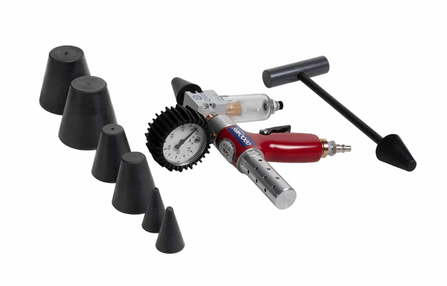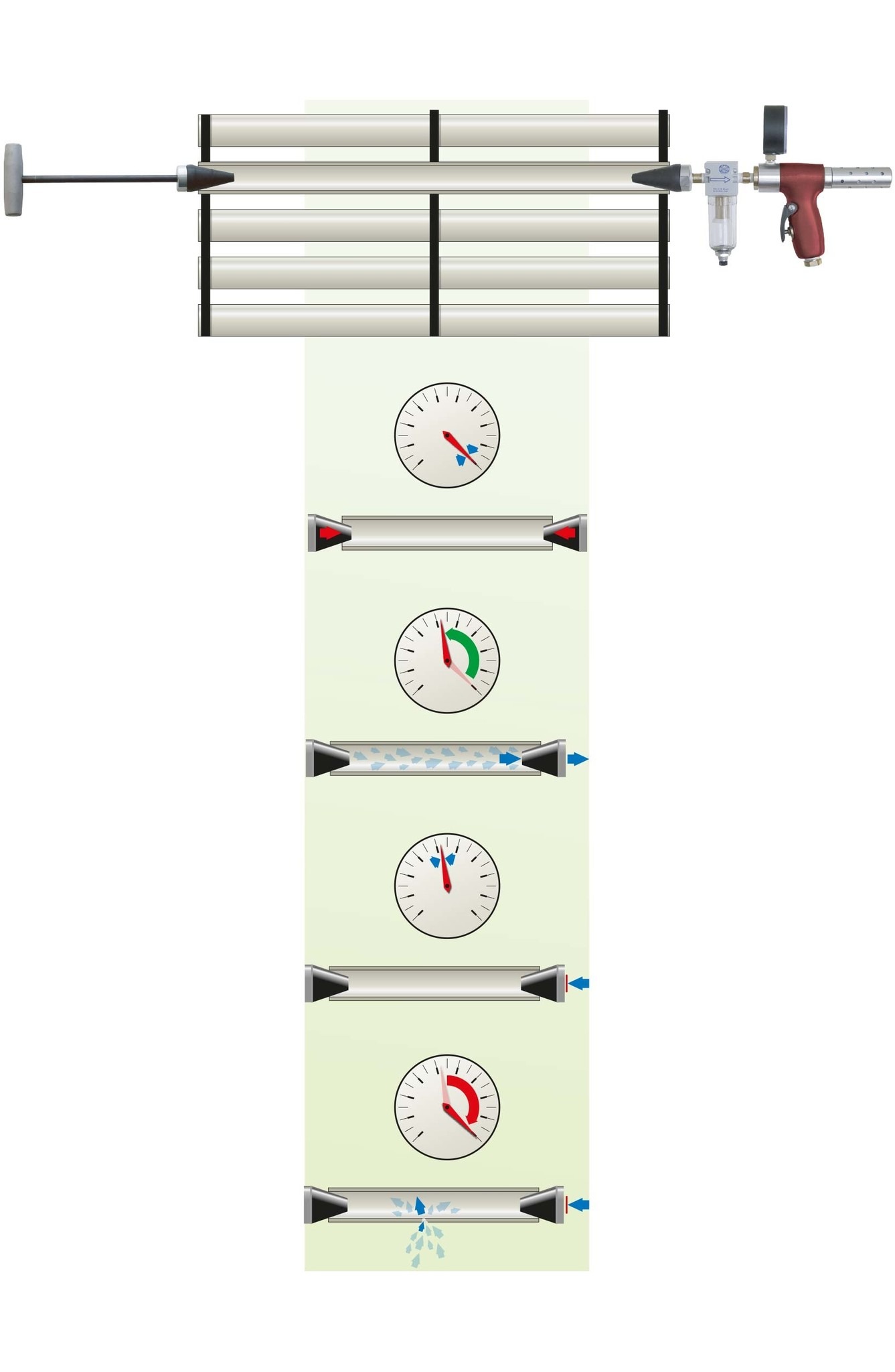 El uso del VAC-1000 es sencillo y eficaz. El dispositivo se introduce en un extremo del tubo mediante una boquilla cónica, mientras que el extremo opuesto se sella con una pieza en T y una boquilla cerrada idéntica, creando un sellado completo. Una vez conectado al aire comprimido, el sistema genera un vacío en el interior del tubo, que puede controlarse en un manómetro. Una lectura estable indica que el tubo no tiene fugas, mientras que una caída en la lectura del manómetro confirma la presencia de una fuga.