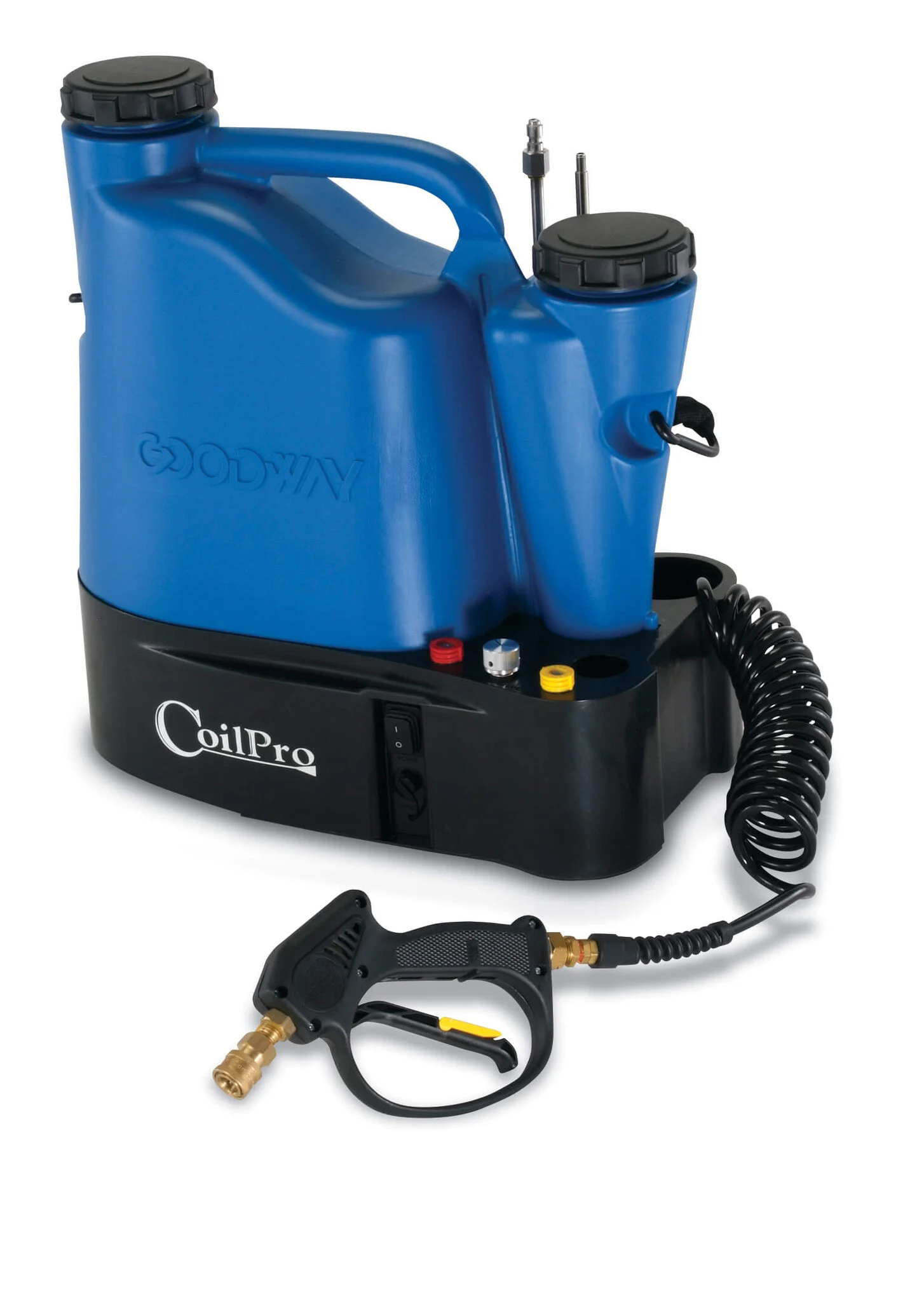 El Goodway CC-JR es un sistema portátil y compacto diseñado para limpiar pequeñas baterías de intercambiadores de calor refrigerados por aire, como los sistemas de aire acondicionado. Funciona con pilas y dispone de dos contenedores de líquido, lo que permite que el sistema funcione incluso cuando no se dispone de alimentación externa o suministro de agua.
