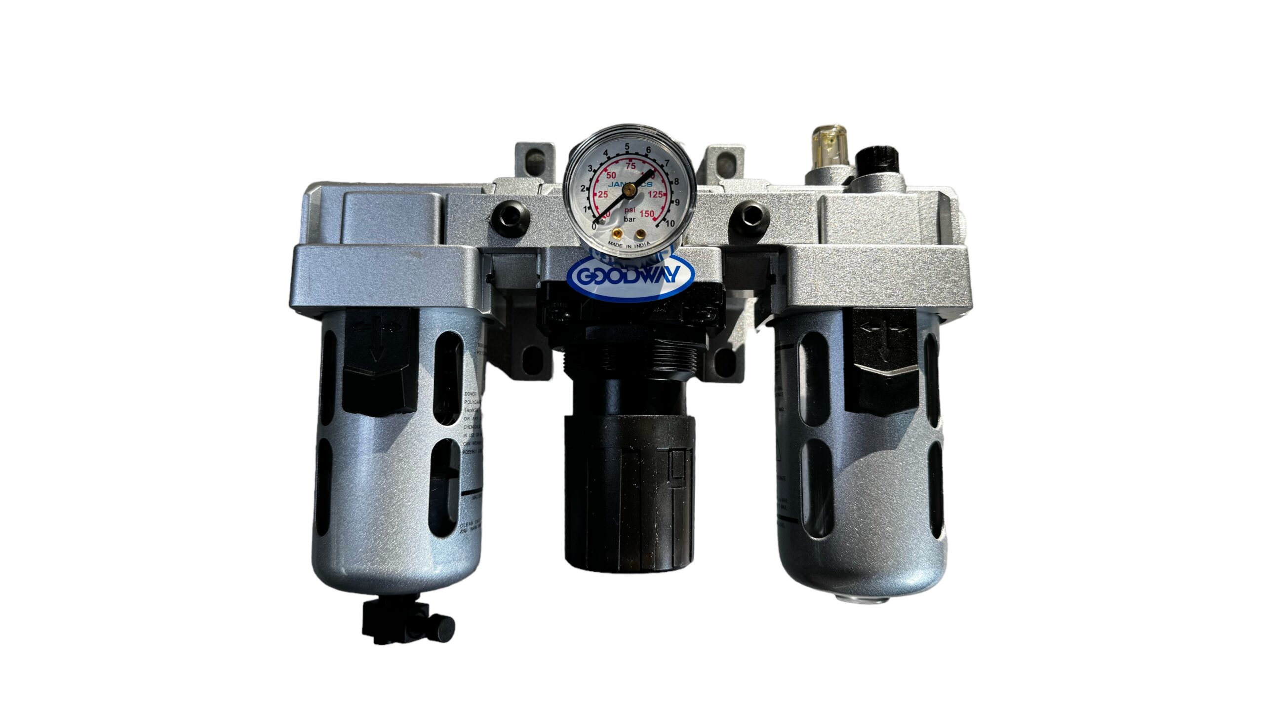 Los equipos accionados por aire funcionan de forma más eficaz y duran más cuando el suministro de aire se trata adecuadamente. Para garantizar una regulación y calidad óptimas del aire y una mayor vida útil del motor, Goodway Benelux recomienda utilizar una combinación de lubricador, filtro y regulador de aire.