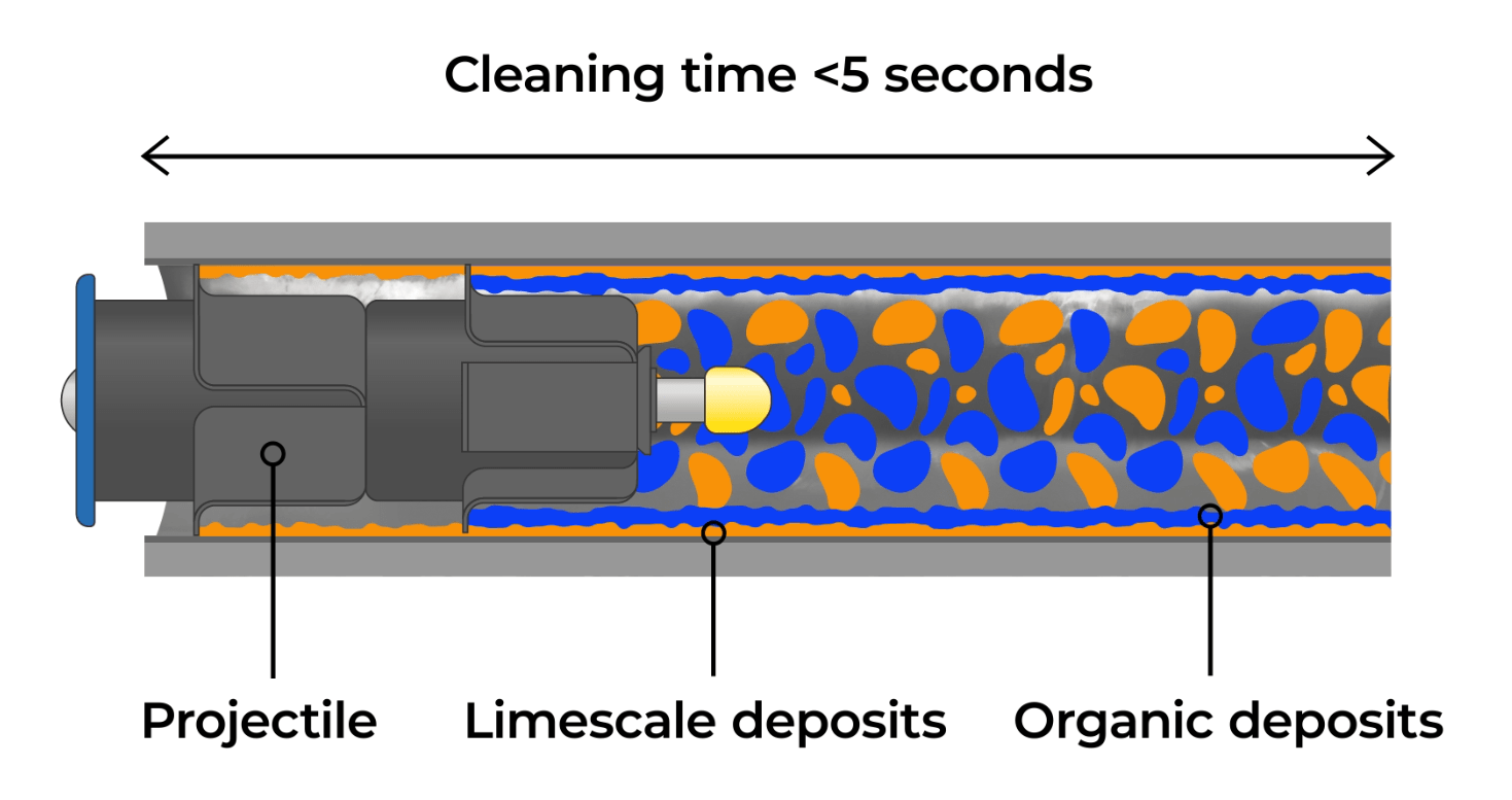 Precaución: Los proyectiles de limpieza de acero al carbono para tubos de intercambiadores de calor no son adecuados para intercambiadores de calor con depósitos extremadamente duros que requieran una limpieza a ultra alta presión (más de 2.500 bares). En tales casos, estos proyectiles pueden utilizarse como paso de limpieza secundario para eliminar los depósitos restantes tras la limpieza inicial a alta presión. Este método de dos pasadas suele emplearse antes de una inspección por corrientes inducidas.