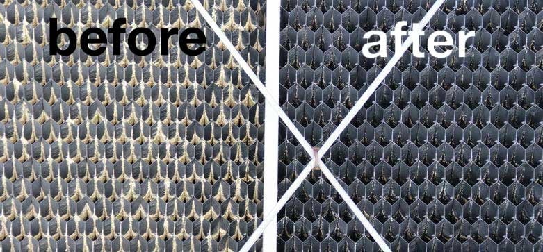 A veces, los condensadores enfriados por aire pueden tener depósitos calcáreos en las bobinas, sobre todo con sistemas adiabáticos o cuando los clientes rocían agua en las bobinas para aumentar el rendimiento de refrigeración, lo que suele ocurrir en verano. Para eliminar esta capa de cal, la TFC-JR puede utilizarse en combinación con el gel ScaleBreak y el limpiador de condensadores CC-400HF.