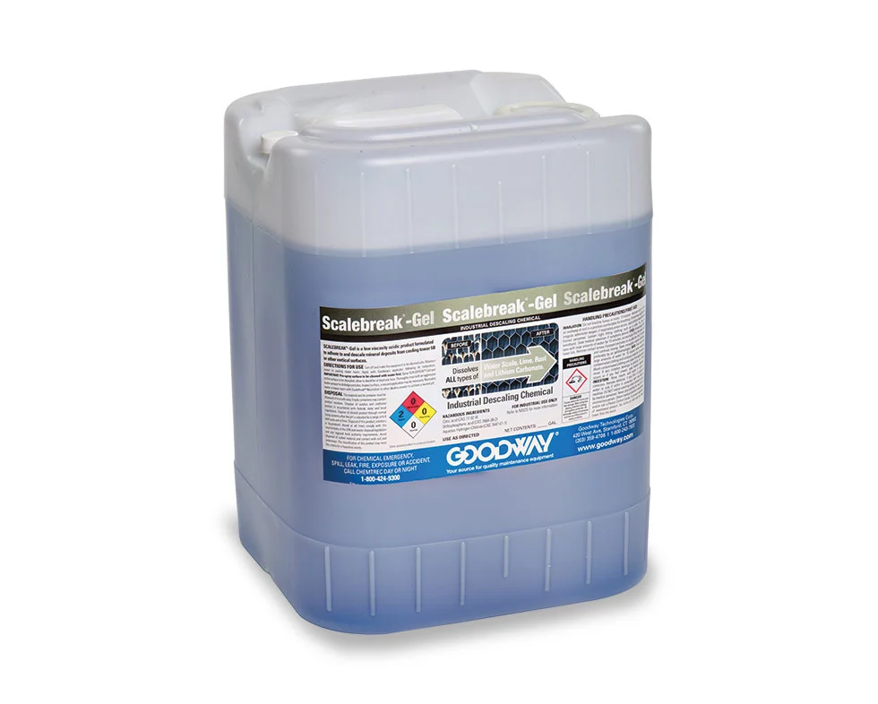 Goodway ScaleBreak-gel es una solución desincrustante única diseñada para eliminar incrustaciones -como incrustaciones y bioincrustaciones- de los componentes de las torres de refrigeración. Es un producto ácido de alta viscosidad formulado para adherirse y desincrustar los depósitos minerales del relleno de la torre de refrigeración u otras superficies verticales.