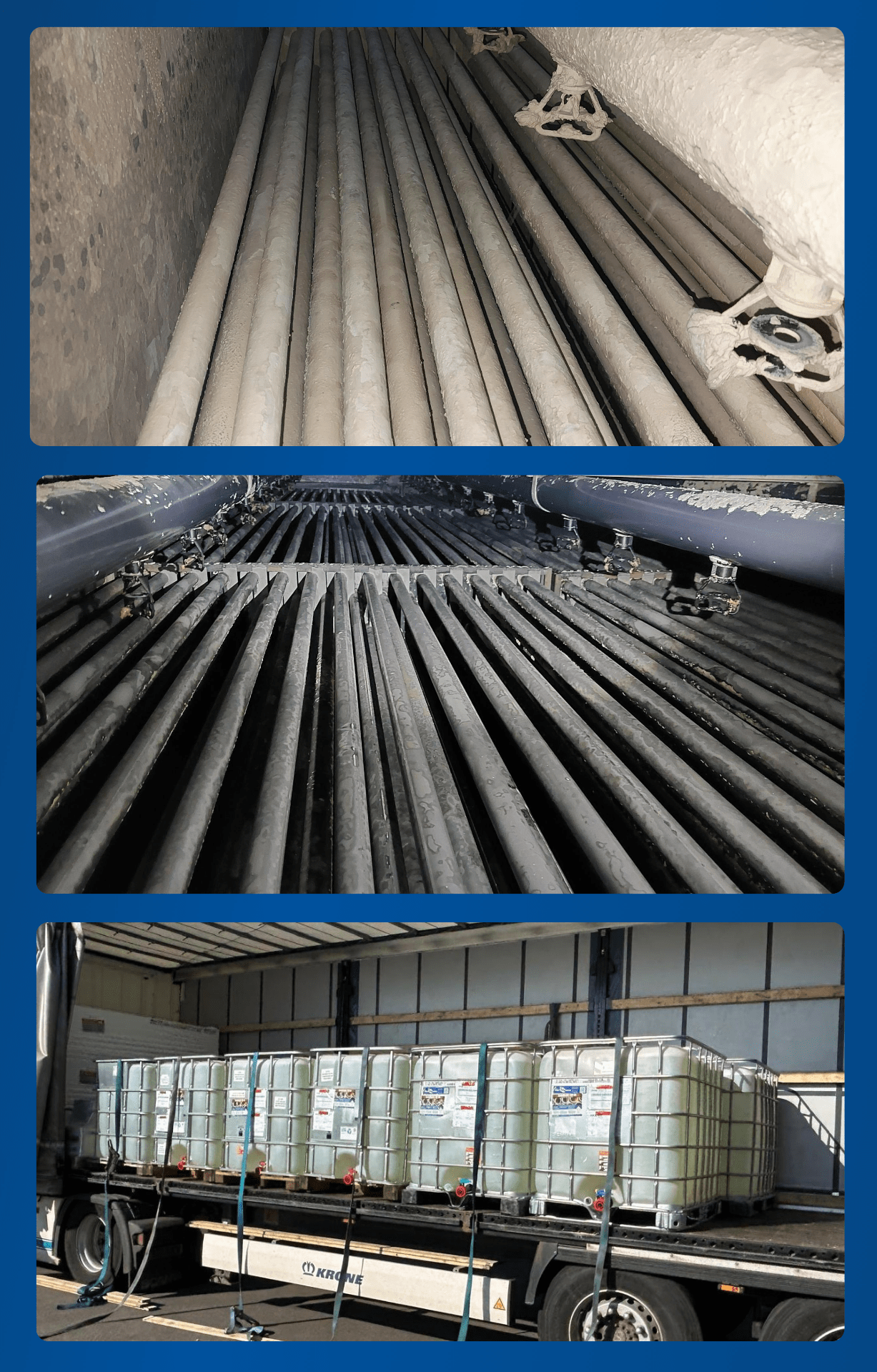 Debido al grado extremo de incrustación, la limpieza tuvo que realizarse en varias fases, con tiempos de circulación prolongados para romper la incrustación dura y estratificada. Al final del proyecto, se utilizaron un total de diecinueve (19) contenedores IBC de 1000 litros de ScaleBreak-MP para devolver los tubos a su estado casi original, sin causar ningún daño a los haces de acero galvanizado ni a otros componentes críticos del condensador.
