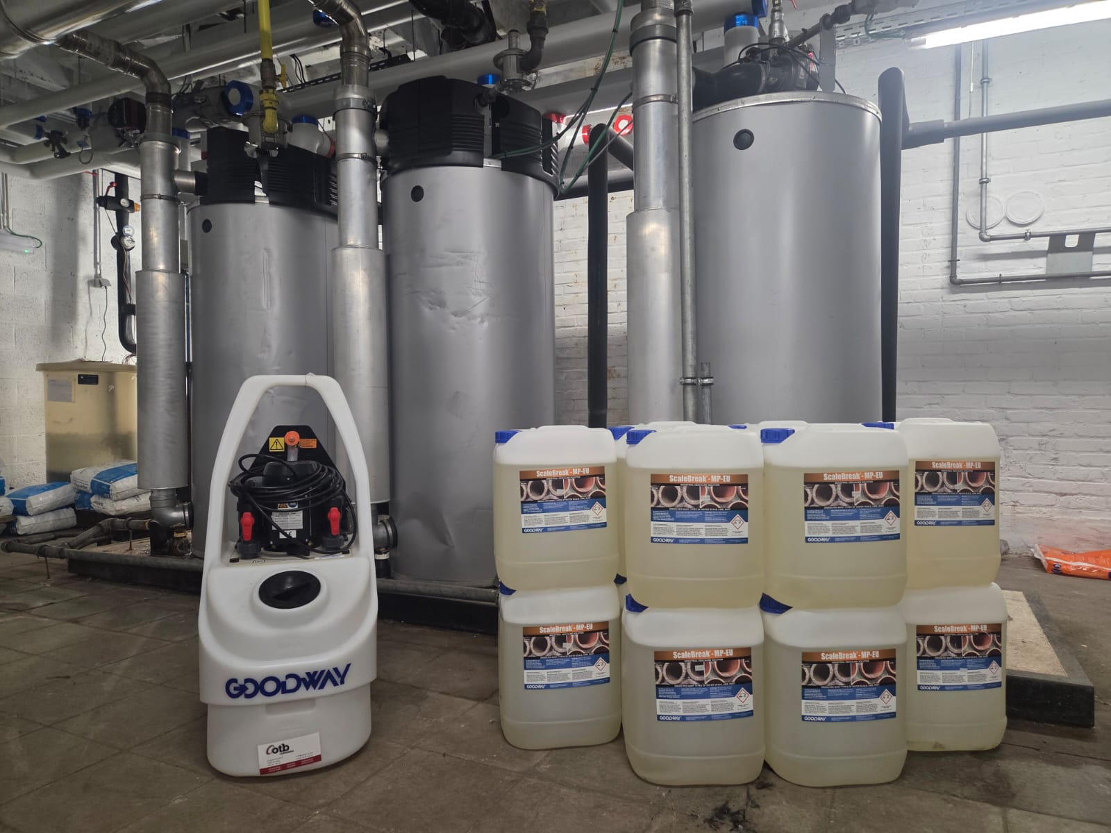 El equipo de Goodway Benelux proporcionó su sistema de bomba desincrustante GDS-C92-FWF en combinación con la solución desincrustante Goodway ScaleBreak-MP para eliminar eficazmente la acumulación de incrustaciones en estas calderas. Esta potente combinación permitió al cliente limpiar cada sistema a fondo y de forma segura, restaurando un rendimiento casi óptimo en un periodo de tiempo relativamente corto.